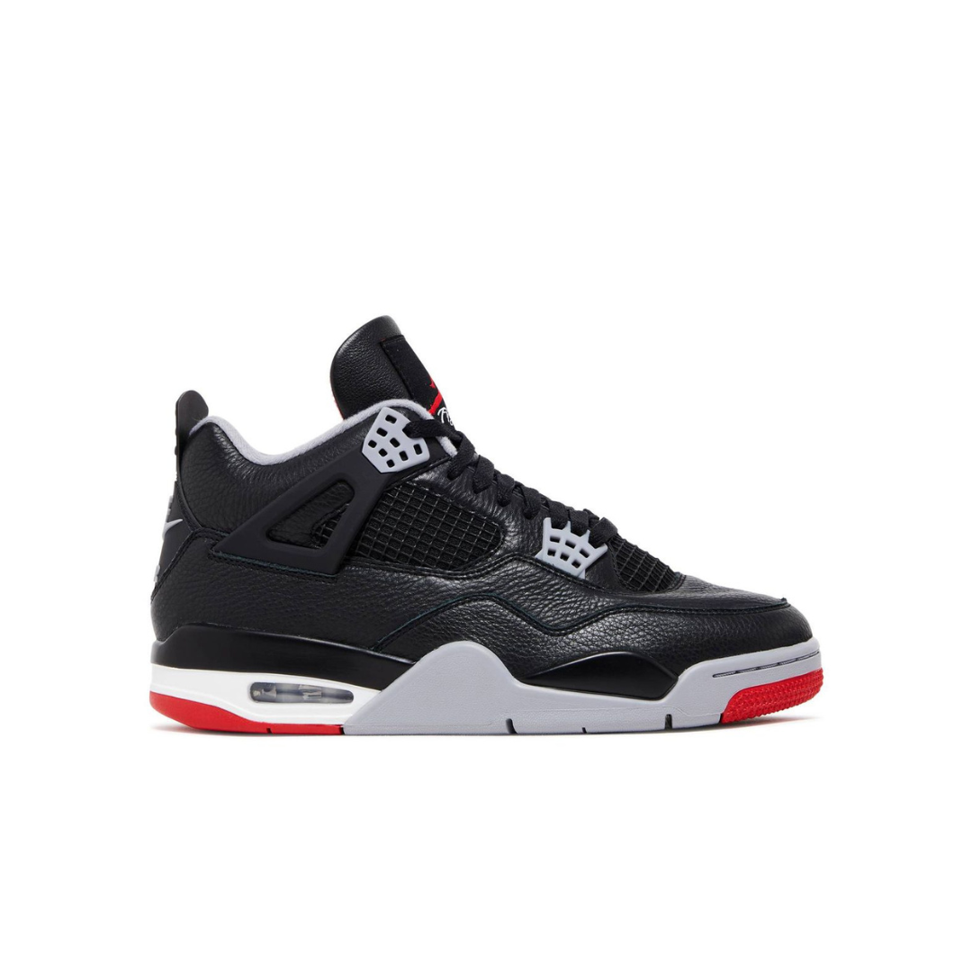 The Air Jordan 4 Retro 'Bred Reimagined' is a new iteration of the iconic design which replaces the original 1989 release's nubuck material with a black leather upper. Quarter panel netting, gray molded eyelets, and Nike Air branding on the heel tab are heritage details, and a crimson Jumpman logo adorns the woven Flight tongue tag. The PU midsole features encapsulated Air-sole cushioning in the forefoot and an exposed Air unit in the heel, resting on a pre-distressed rubber outsole with a herringbone traction pattern.