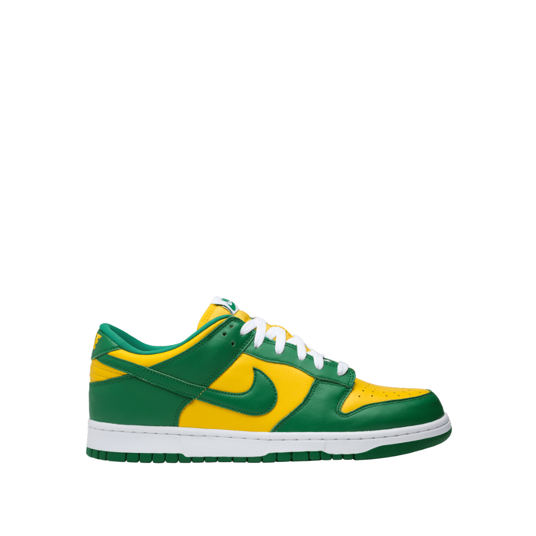 The Nike Dunk Low SP ‘Brazil’ replicates the look of the classic ‘Brazil’ Dunk from 2001, featuring a simple two-tone color scheme that combines a yellow leather base with contrasting green overlays. Nike branding adorns the heel tab and stitched-on woven tag atop the lightly padded nylon tongue. The low-profile silhouette is mounted on a sturdy white foam midsole, reinforced underfoot by a green rubber outsole.
