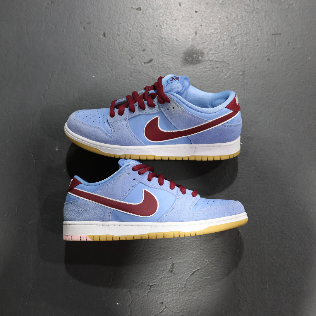 The Nike Dunk Low Premium SB 'Philadelphia Phillies' is inspired by vintage jerseys of the historic MLB team. The nubuck and suede upper features a light shade of Valor Blue, with a Team Maroon Swoosh outlined with white trim. A contrasting white midsole gives way to a gum rubber outsole where a small patch of pink on the right shoe signifies stepping in bubble gum. Nike SB tags on the outside of the tongue are matched with Philadephia inspired graphics on the inside tongue tags including a cheesesteak on the left shoe and a Liberty Bell on the right.