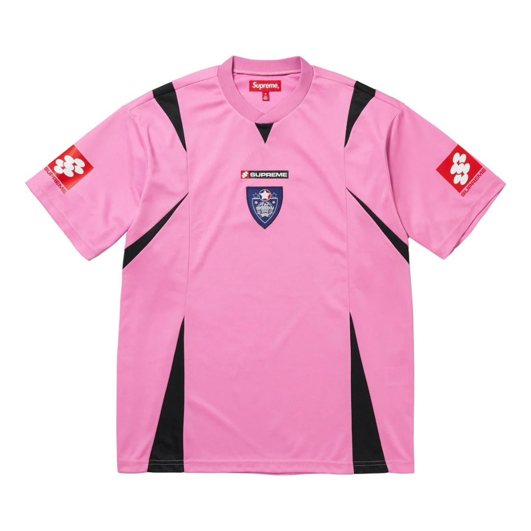 Poly jersey with contrast mesh panels. Woven logo patch on chest and jacquard logo rib at back neck. Printed logo on chest and printed graphic on sleeves.