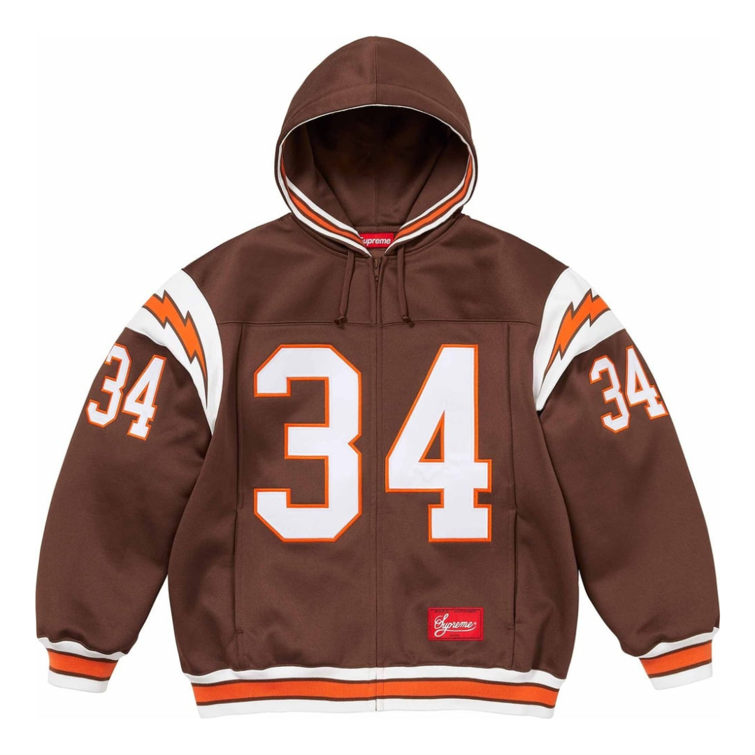 Brushed-back poly fleece with full zip closure. On seam hand pockets at lower front. Graphic appliqué at front, sleeves and back. Logo appliqué at back. Inset graphic panels at shoulders and athletic label at lower front.