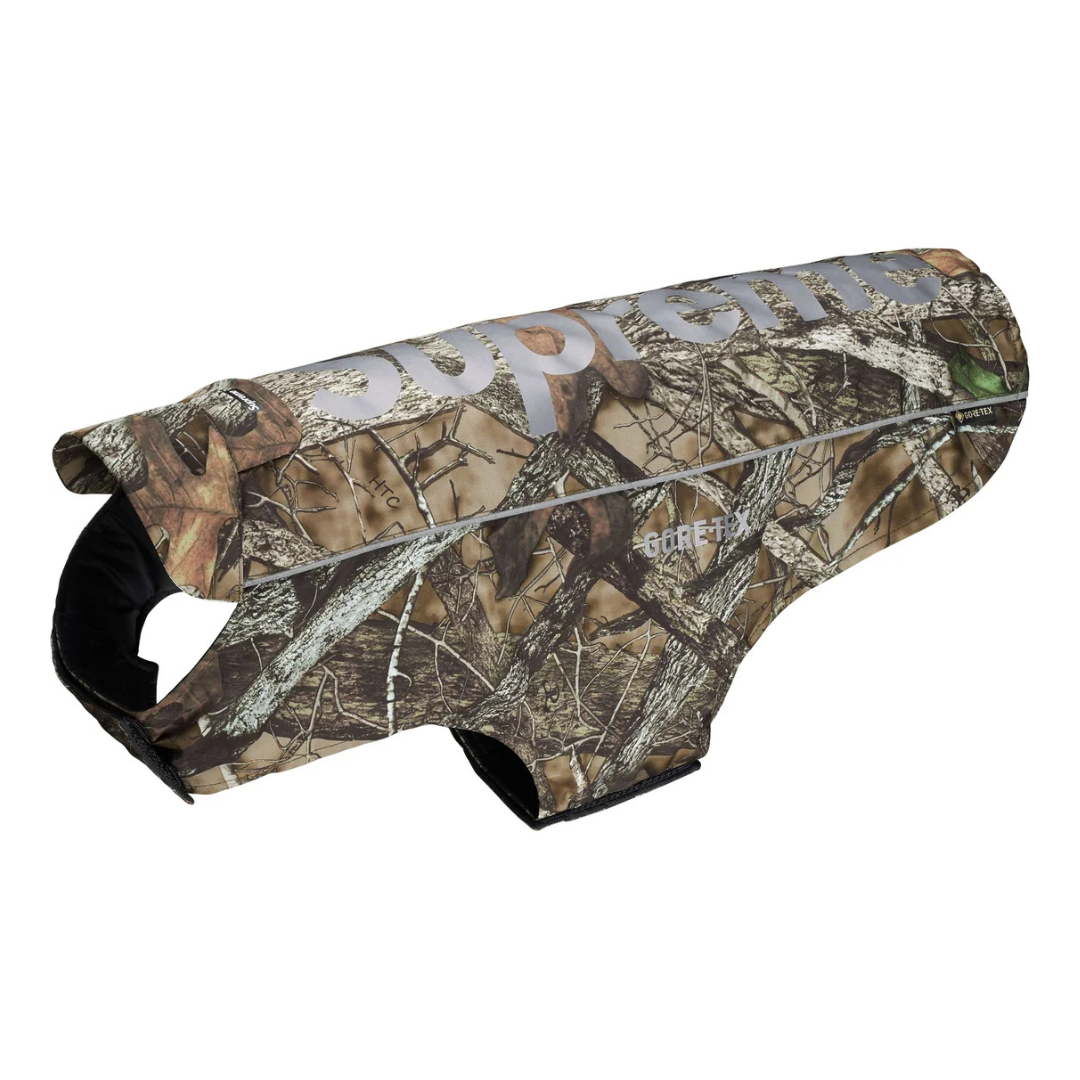 Waterproof, breathable GORE-TEX nylon with Primaloft® insulation and lining. Velcro strap closures at stomach and shoulder. Reflective printed logos at top and sides. Packable into zip pouch with carabiner clip.
